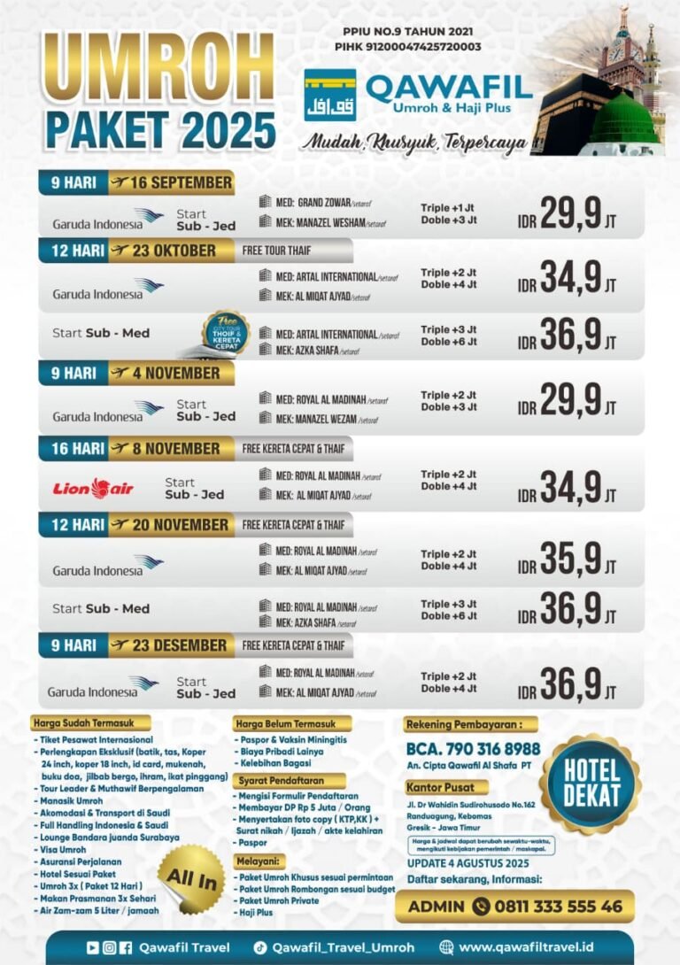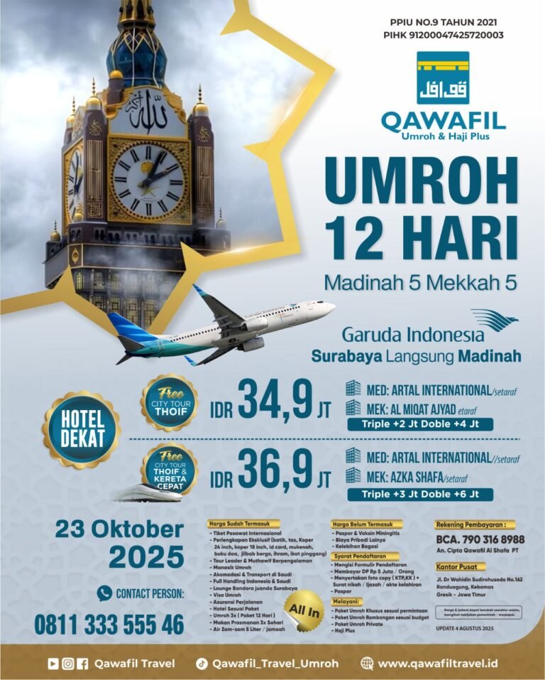 Paket Umroh Bulan Oktober 2025 34.900.000 23 Oktober 2025 12 Hari Garuda Indonesia Bandara Juanda Surabaya Madinah Artal International/Setaraf Mekkah Al Miqat Ajyad/Setaraf Info Detail